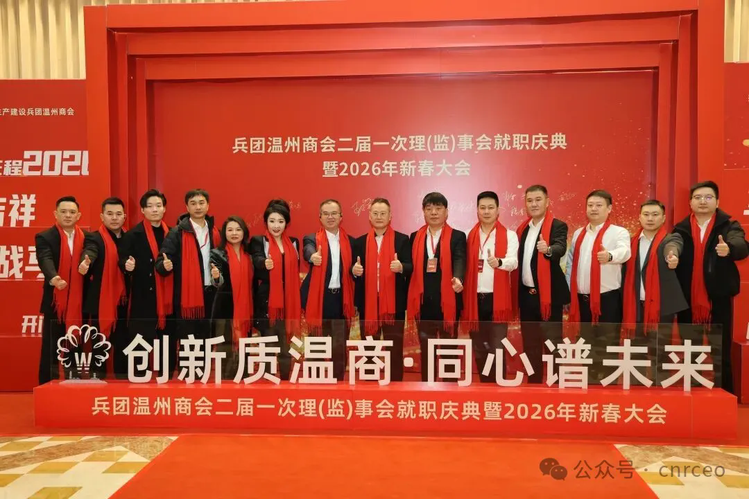 2026年1月26日,以“创新质温商,同心谱未来”为主题的新疆生产建设兵团温州商会第二届会员大会暨二届一次理(监)事会在新疆迎宾馆隆重举行。温州市投资促进局党组成员、副局长,全国温州商会总会秘书长詹光华出席会议并讲话。新疆温州总商会名誉会长黄宣钱、郑茶妹,荣誉会长董永平、陈少波、蒋益东,党支部书记、温州市在新党工委书记杨恒疆,执行会长吴作班,监事长黄澄宇,常务副会长吴建平、黄正君、付必华、邹学银、廖丹茹、蔡晓春、尤长生、潘锦耀等应邀出席会议。
