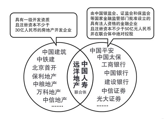 (1)从北京市国土资源局下发的挂牌文件中明确看到,对于竞买人资格一项,文件显示:“本次出让宗地的竞买人须为金融机构与房地产企业组成的联合体,其中:金融机构应为由中国银行业监督管理委员会、中国证券监督管理委员会和中国保险监督管理委员会等国家金融监管部门批准设立的具有法人资格的金融企业,且注册资本不少于50亿元人民币,并在联合体中绝对控股;房地产开发企业应具备房地产开发一级资质,且注册资本不少于30亿元人民币。” 由此,经分析,符合上述资格的企业如下: