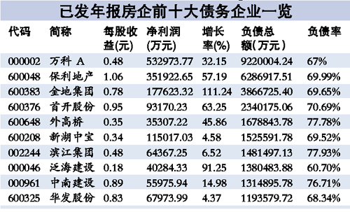 值得注意的是,虽然房地产企业2009年都赚得盆满钵满,但上述已披露年报的69家公司,截至去年年底,债务总额达到5100.62亿元,同比增长了34.34%,多数房企的资产负债率在70%以上。