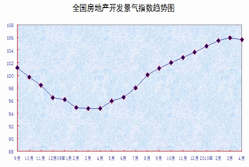 4月份,全国房地产开发景气指数(简称“国房景气指数”)为105.66,比3月份回落0.23点,比去年同期提高10.90点。