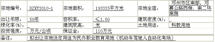 一、宗地概况本批次拟供地数量为1宗。该宗地编号为:DZXY2010-1 ,位于邓州市区南部,邓襄公路西侧、南二环南侧,面积19333平方米,设定用途为民办职业教育用地(机动车驾驶人自动化考场)。该宗地已经河南省人民政府豫政土[2010]88号文件批准征收为国有,属于邓州市2009年度第三批城市建设用地中的拟报项目之一。二、供地方式有使用土地的单位和个人,应在7月20日前向邓州市国土局建设用地科提交书面意向用地申请。截止期满,该宗地若只有一个意向用地者的,邓州市国土资源局将采取协议方式出让该宗地。有两个以上意向者的,邓州市国土资源局将采取挂牌方式出让该宗地。