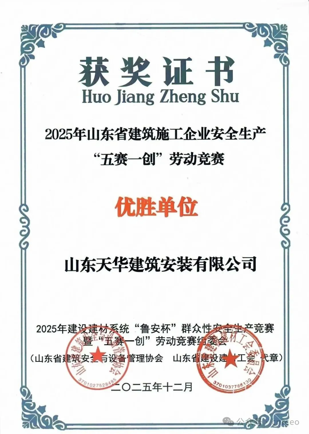 近日,山东省建筑安全与设备管理协会、山东省建设建材工会颁发《关于公布2025年山东省建筑施工企业安全生产“五赛一创”劳动竞赛获奖证书,天华实业集团荣获“优胜单位”“优胜项目部”及“优胜个人”多项荣誉称号。
