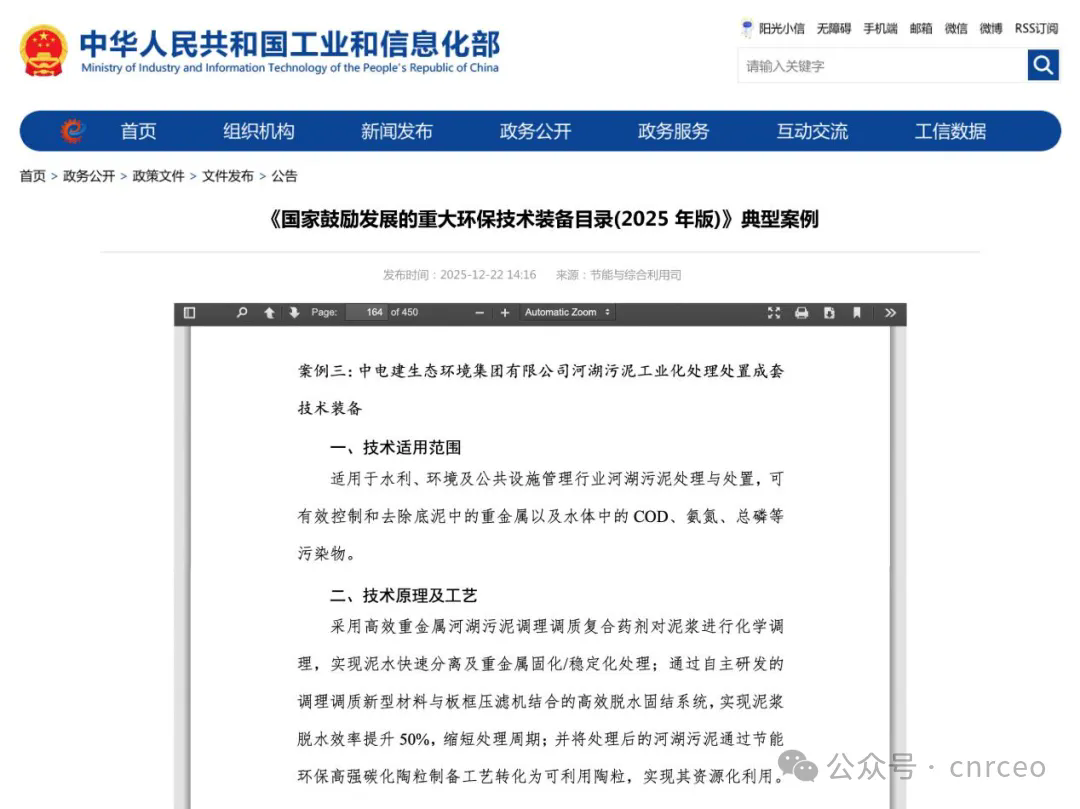 近日,工业和信息化部联合生态环境部正式发布《国家鼓励发展的重大环保技术装备目录(2025年版)》和典型案例,中电建生态环境集团公司申报的《河湖污泥工业化处理处置成套技术装备》成功入选。